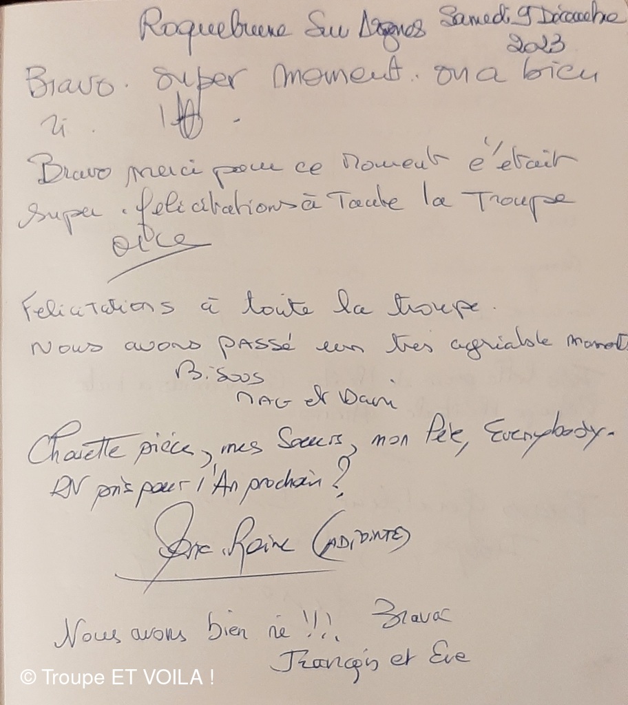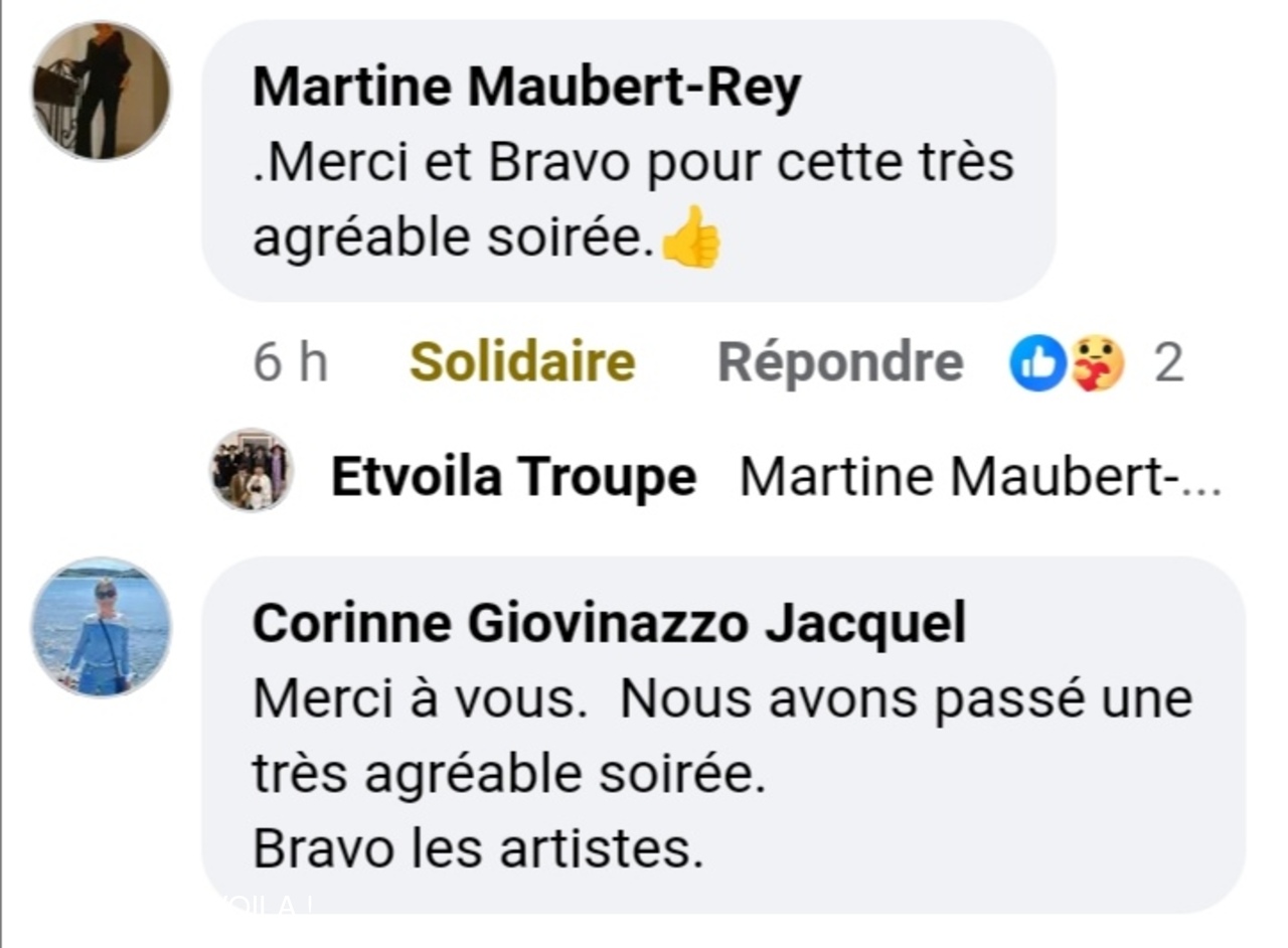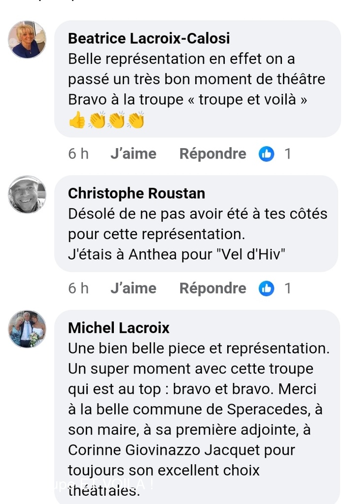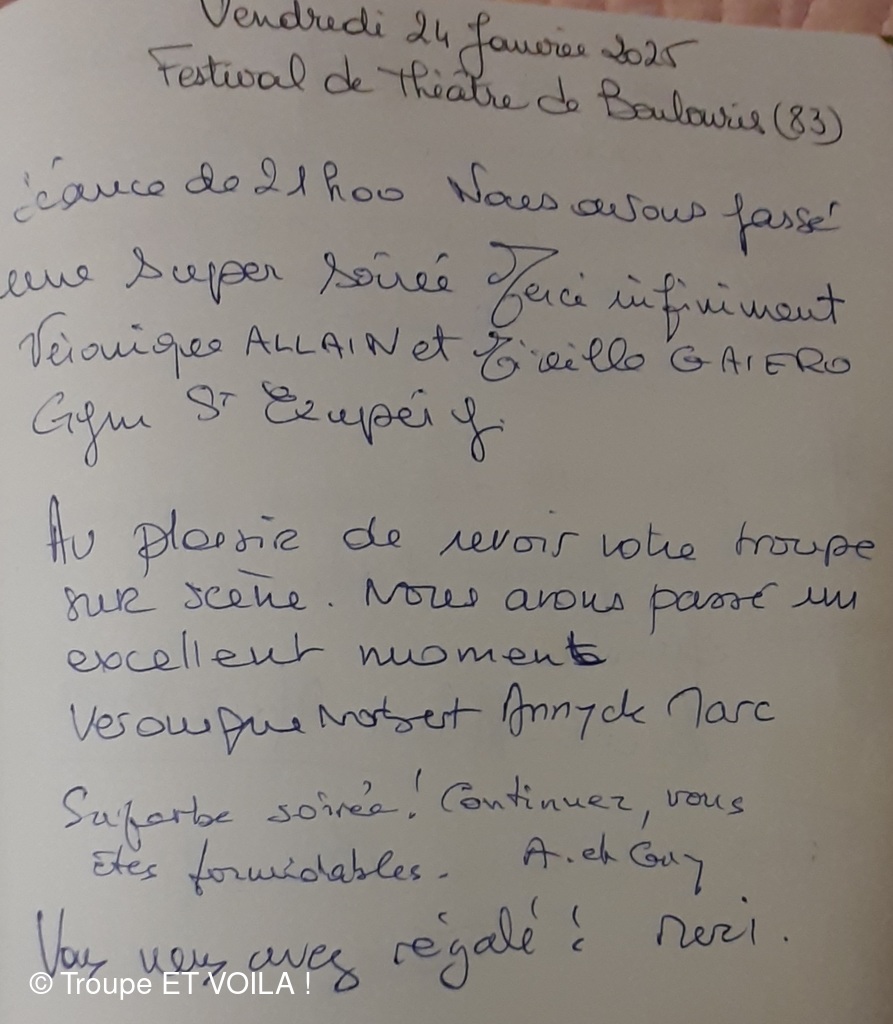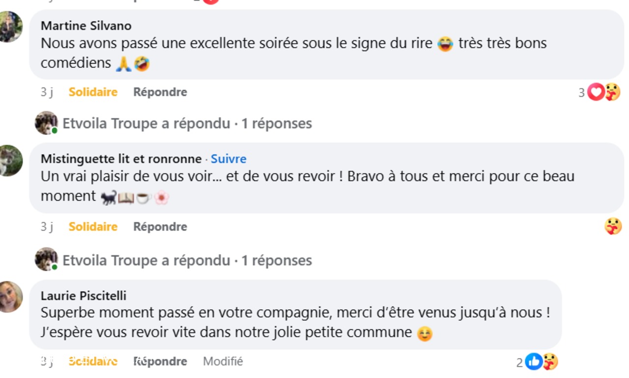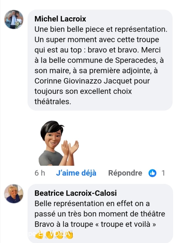 • Nous avons assisté à la à la piece (une veillée pas coutumière) le 12 septembre à Plascassier et nous avons passé une délicieuse soirée , beaucoup ri ; les acteurs sont formidables ; si vou...